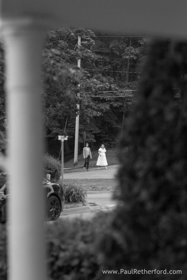 When I arrived at the planned location I noticed the homeowner out on the lawn doing yard work.  I introduced myself and asked if she would allow me to “hide” on her property when the couple walks up.  She is very nice and welcomes me with open arms.  We swap funny stories for a while until I have to go to work.  I look in her backyard and there are a bunch of people behind her bushes.  She says, “they were just standing out in the open and I invited them to hide behind my bushes.”  🙂  Now we have the family hiding behind the bushes and me sitting on the front porch waiting for the couple to walk down from Bay View.